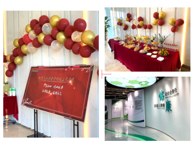 音乐响起,,,,礼花飘扬,,,,杨琴董事长,,,,胡家华副总经理、、李志斌副总经理,,徐南飞总经理助理一同为启用仪式揭幕。。。。红绸揭开了综合办公楼崭新的LOGO铭牌,,,,揭示着铭康生物将以更坚定的信念,,,迈出坚定的步伐,,,走向崭新的未来!!!