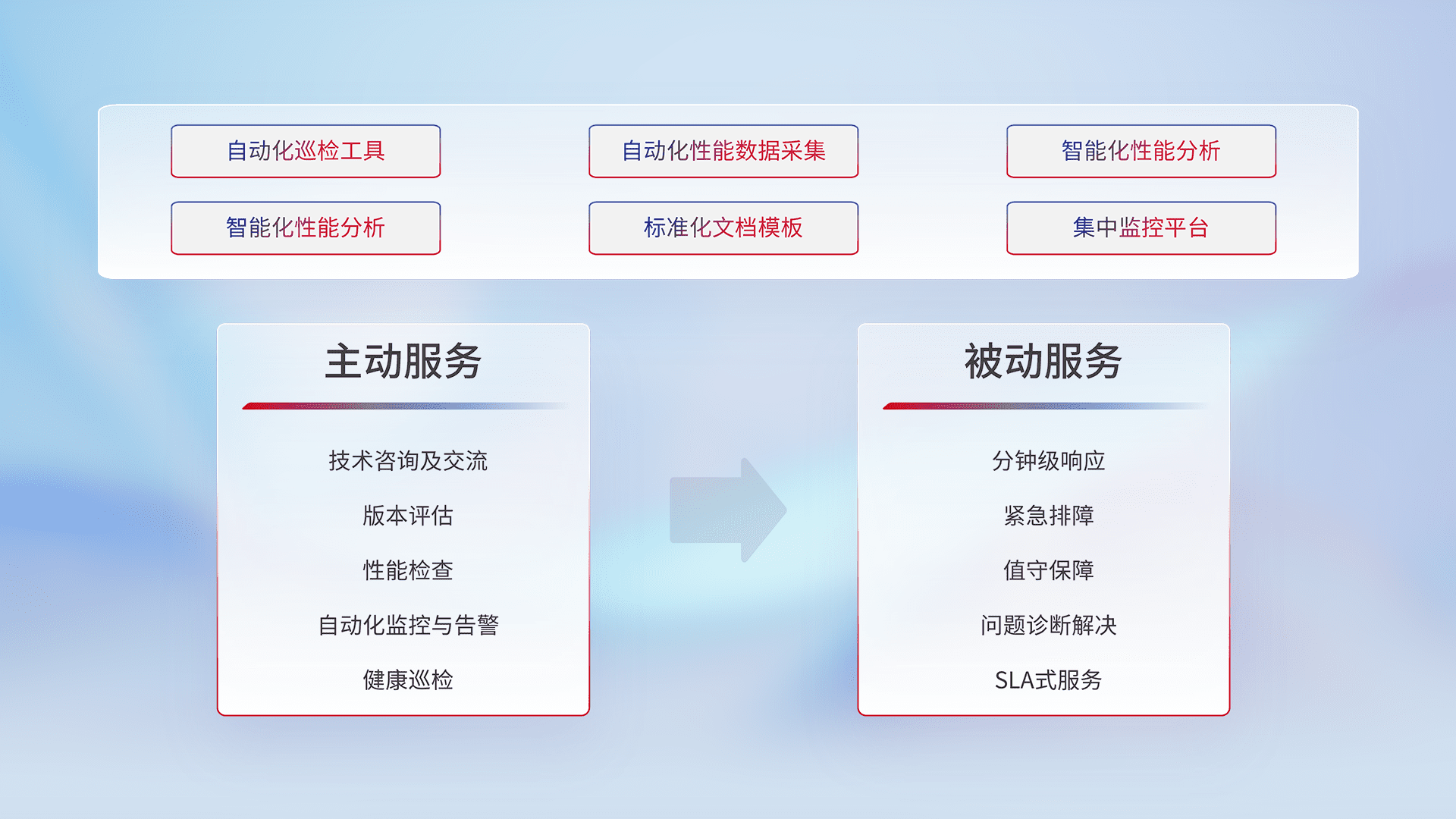 智能化工具和标准化文档,,,,保障服务质量,,,,提供主动服务(包含技术咨询、、、版本评估、、性能检查、、自动化监控与告警、、、健康巡检)和被动服务包含(分钟级响应、、、紧急排障、、、值守保障、、、问题诊断解决、、SLA服务)。。。