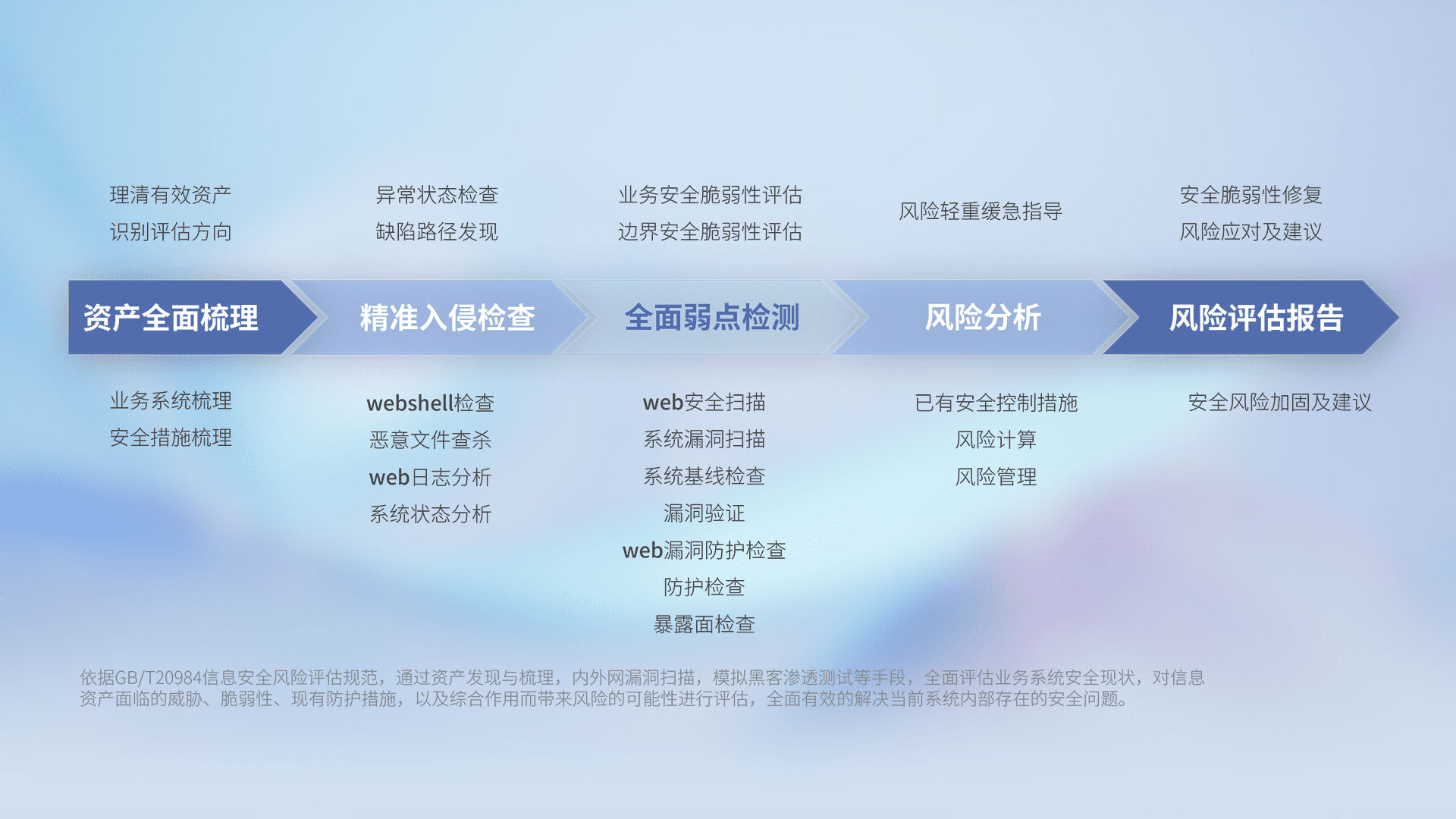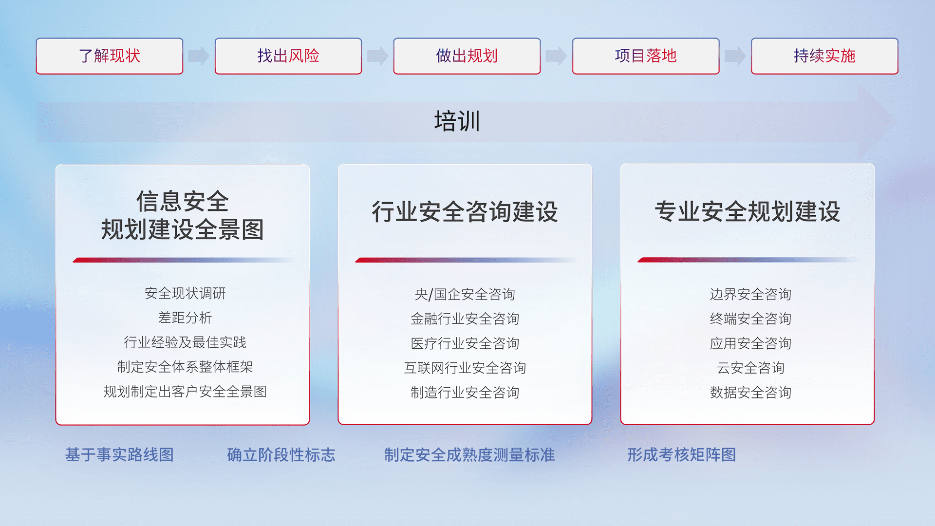 针对客户行业特性,,以专业的安全服务+多厂商联合解决方案提供专属的一站式安全管理服务,,帮助客户全面感知网络空间威胁,,基于识别、、、检测、、、分析、、、、防护、、监测、、、、响应的服务理论模型,,从方案咨询、、集成交付、、、、评估验证、、优化加固、、运维运营,,,,致力于为客户提供完整的闭环管理式安全服务。。。以实战经验为客户打造高抵御风险的安全体系,,帮助客户发现威胁、、、、对抗威胁、、、、处置威胁,,,,不断积累安全对抗能力,,持续保障数字化安全。。